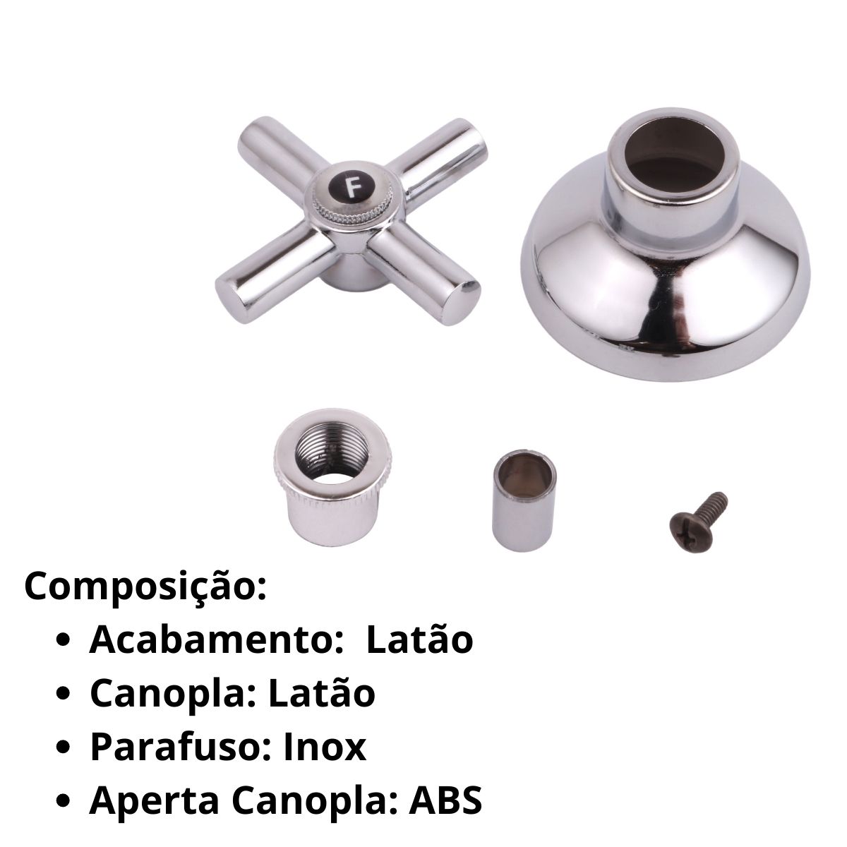 Este acabamento é fabricado em metal, possuindo alta resistência e durabilidade, e é composto por duas partes: a base, que se encaixa no registro e a tampa, que cobre a base e é fixada através de um parafuso.