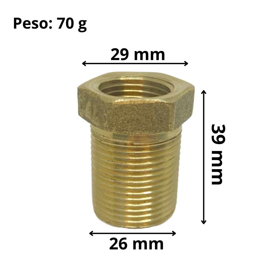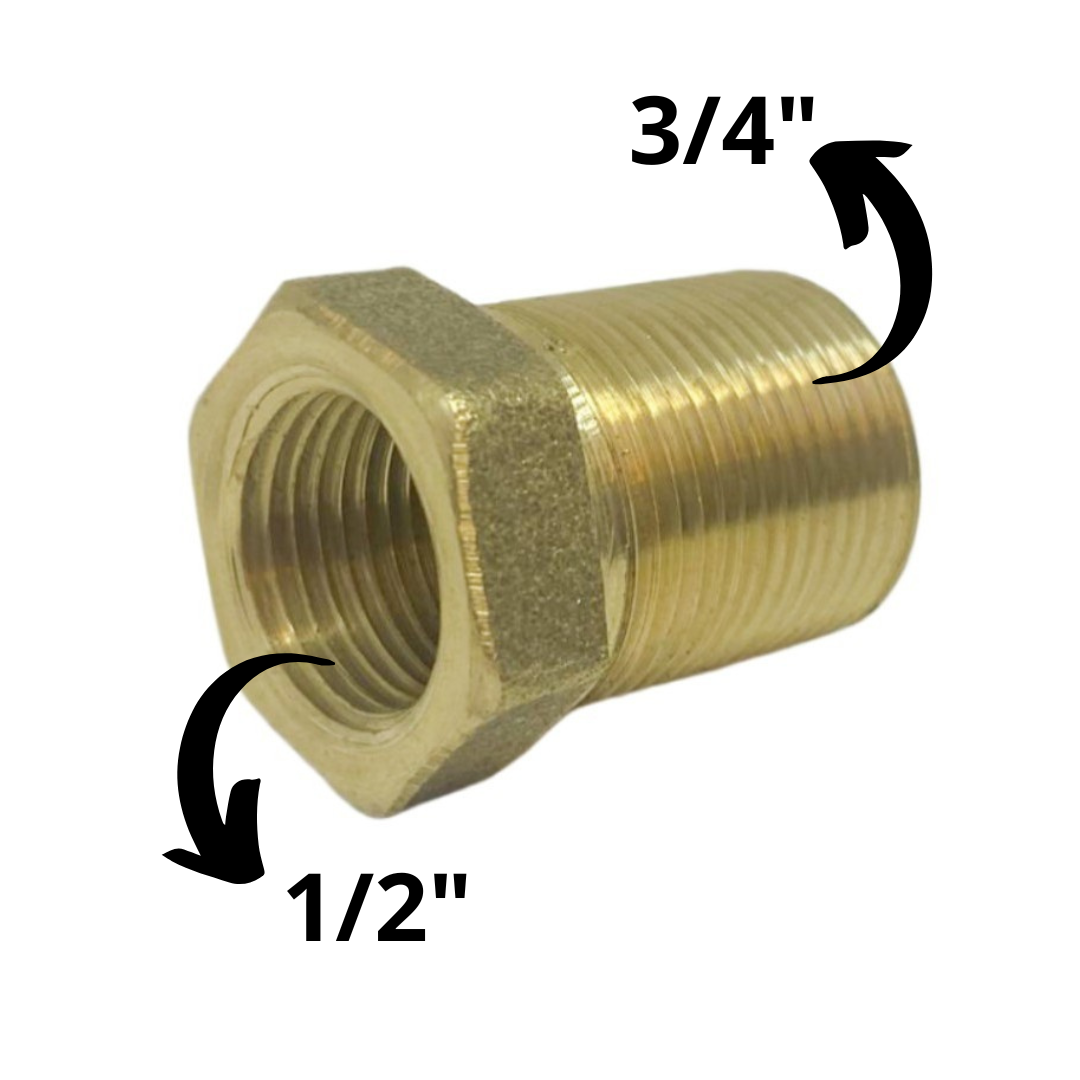 Roscas: A bucha possui duas extremidades com roscas diferentes. Uma extremidade tem uma rosca de 3/4 de polegada, enquanto a outra extremidade tem uma rosca de 1/2 polegada. Essas roscas permitem a conexão com outros componentes, tubos ou acessórios com diâmetros de rosca correspondentes.