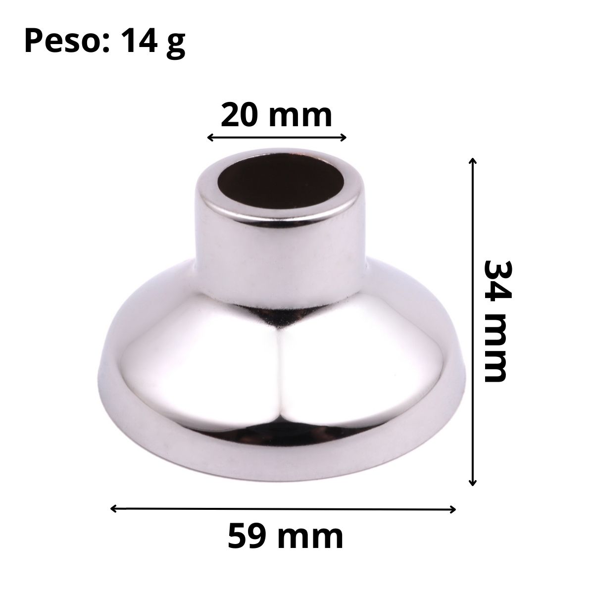 Dimensões do produto: 34 mm (Altura) x 20mm (Diâmetro Superior) e 59mm (Diâmetro Inferior)