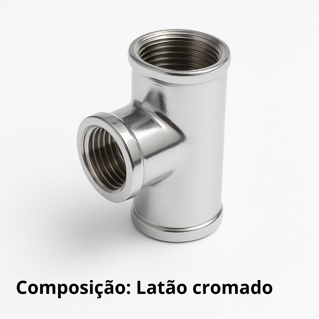 As principais características da conexão TE cromada de latão com rosca fêmea para instalação de gás GLP 3/4 X 1/2 são: