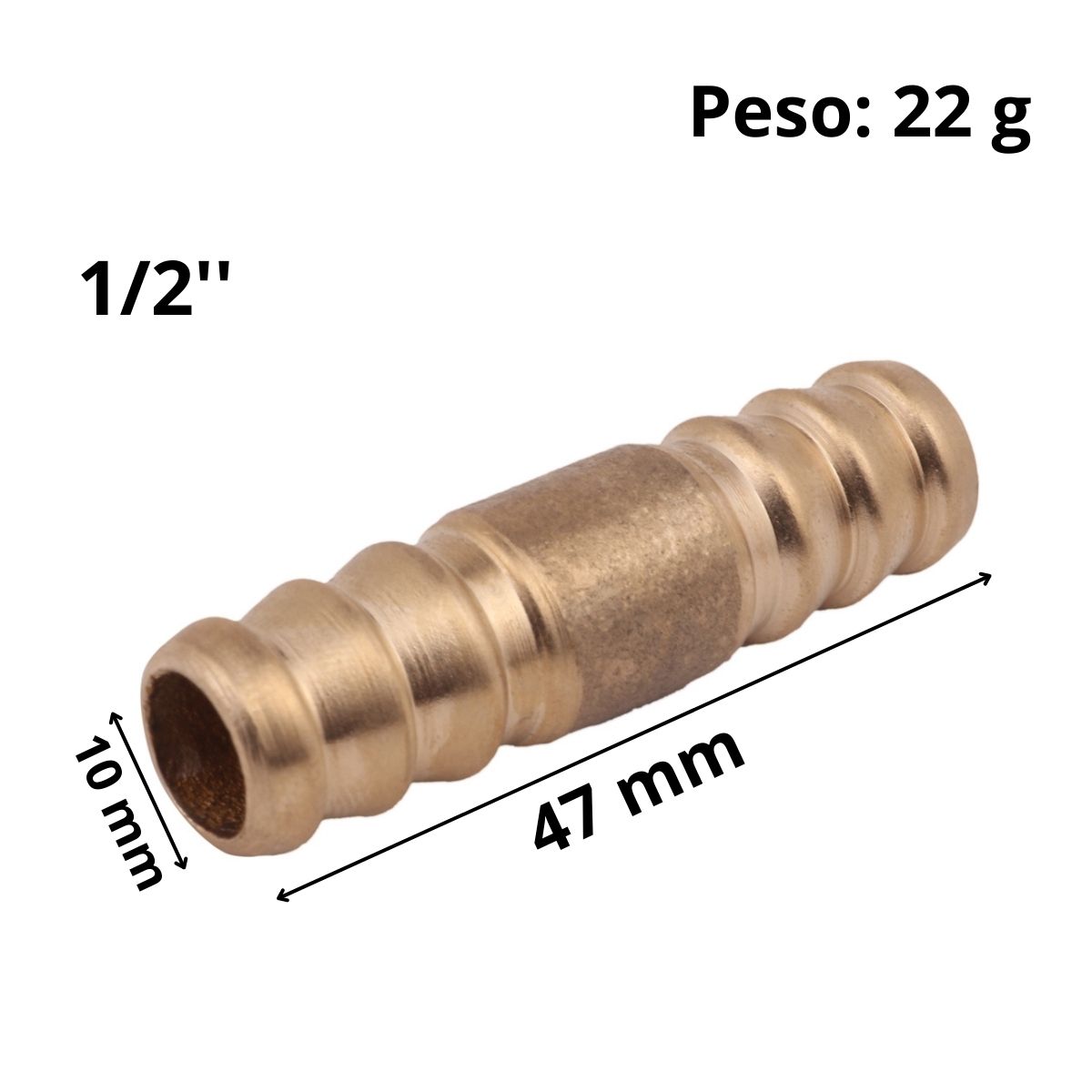 Diâmetro: a conexão possui um bico de 1/2 polegada em cada extremidade, permitindo a conexão com mangueiras de gás que tenham diâmetro interno de 1/2 polegada.