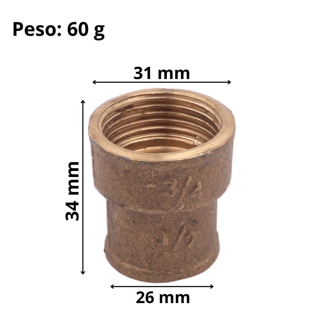 Modelo: Luva De Redução Latão Rosca Fêmea Interna Água Gás 3/4 x 1/2