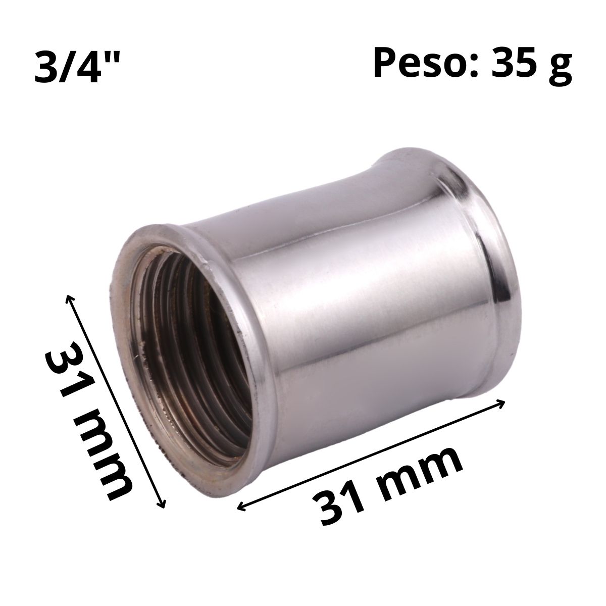 Tamanho da rosca: A luva é projetada para conexões de água/gás de 3/4 de polegada de diâmetro externo, o que a torna compatível com tubos ou conexões de tamanho correspondente.