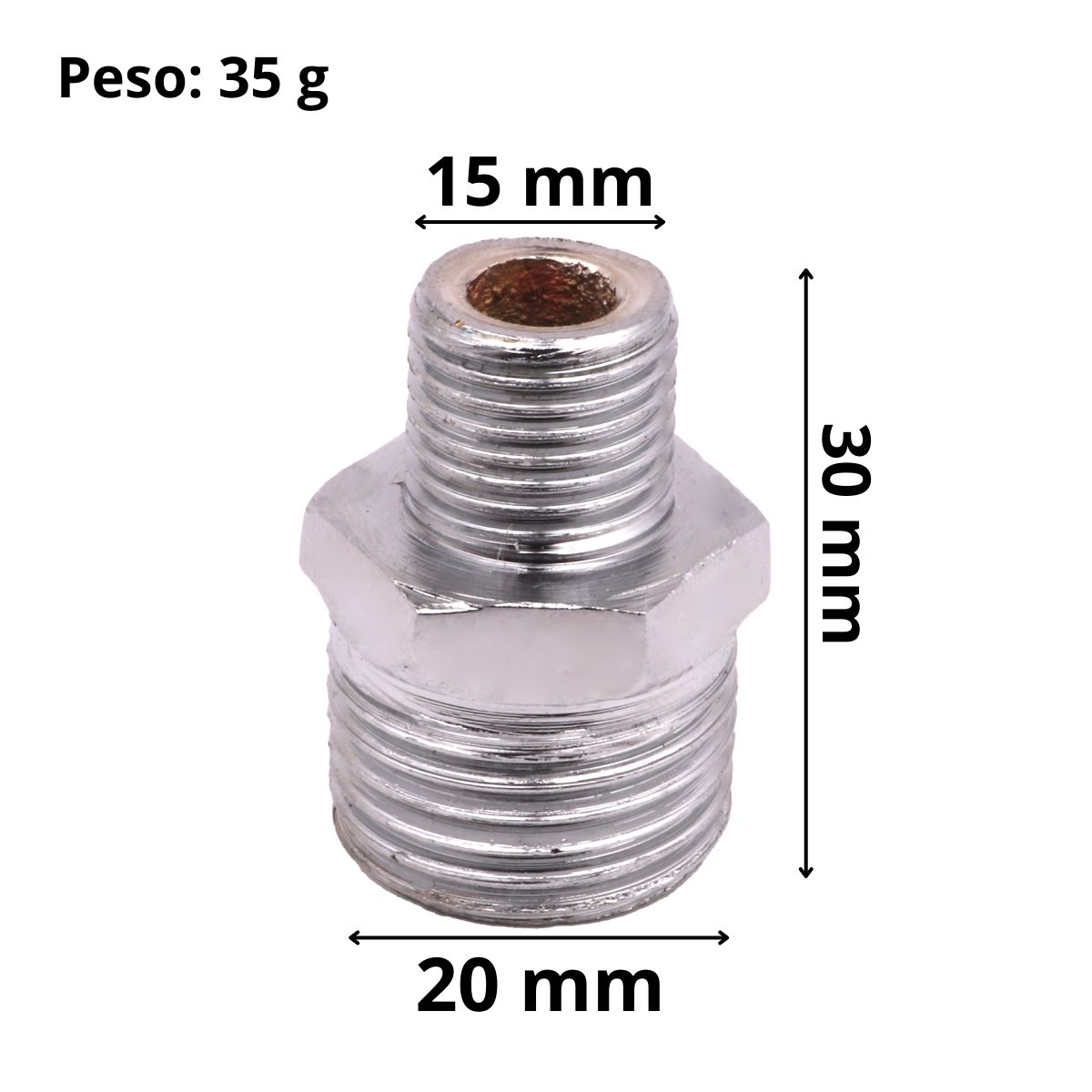 Dimensões: 30mm (Altura) x 15mm (Diâmetro 3/8") x 20mm (Diâmetro 1/2")