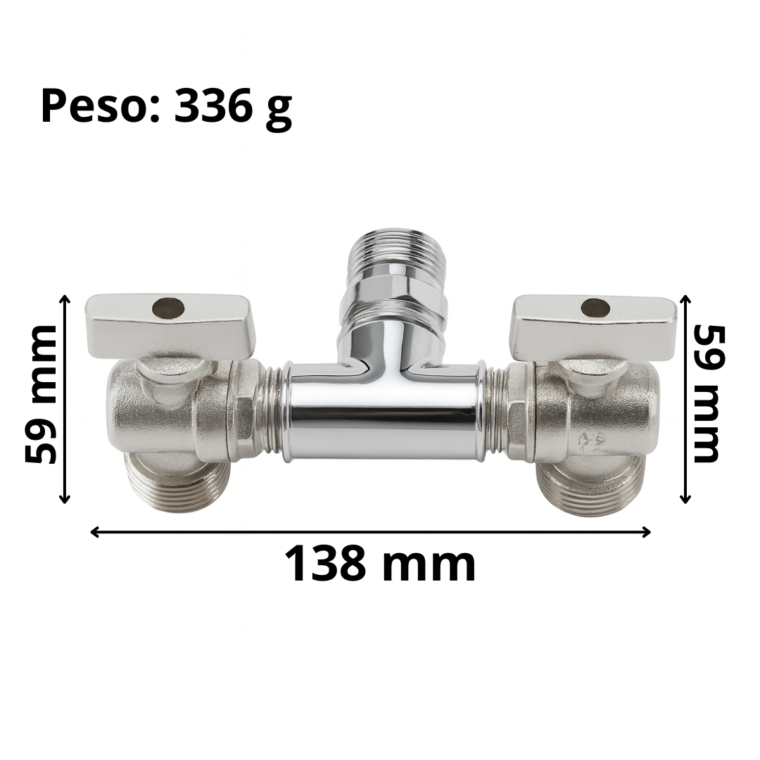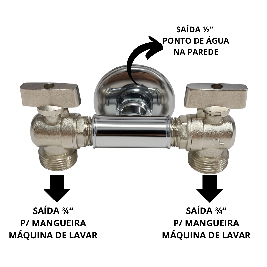 Esse conector tipo "T" com dois registros independentes é a solução prática e eficiente para dividir um único ponto de água (rosca 1/2") da parede em duas saídas 3/4", ideais para mangueiras de máquinas de lavar roupas, tanquinhos ou lavadoras de alta pressão.