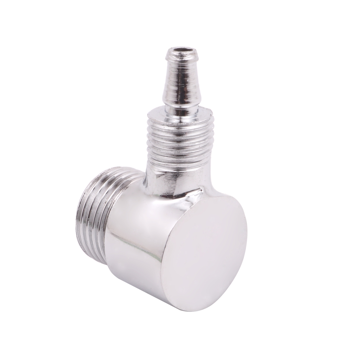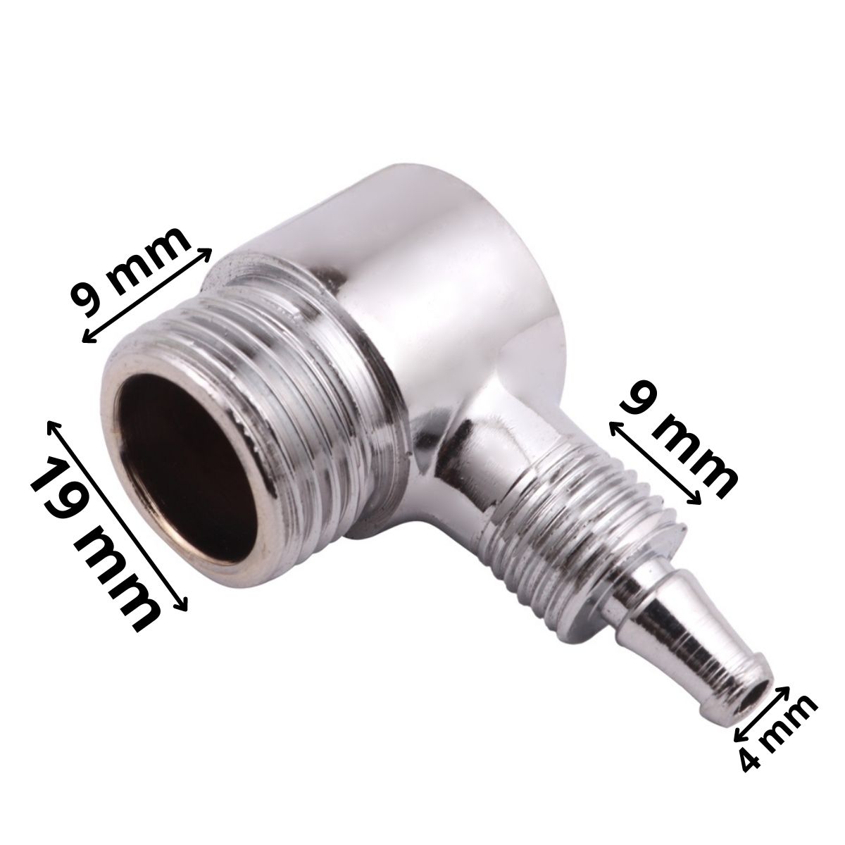 Este adaptador é fabricado em metal cromado, o que garante resistência e durabilidade, além de proporcionar um acabamento elegante e moderno. Ele apresenta um design em forma de L de 90 graus com uma conexão macho em uma extremidade e uma conexão de 3 canecas na outra extremidade.