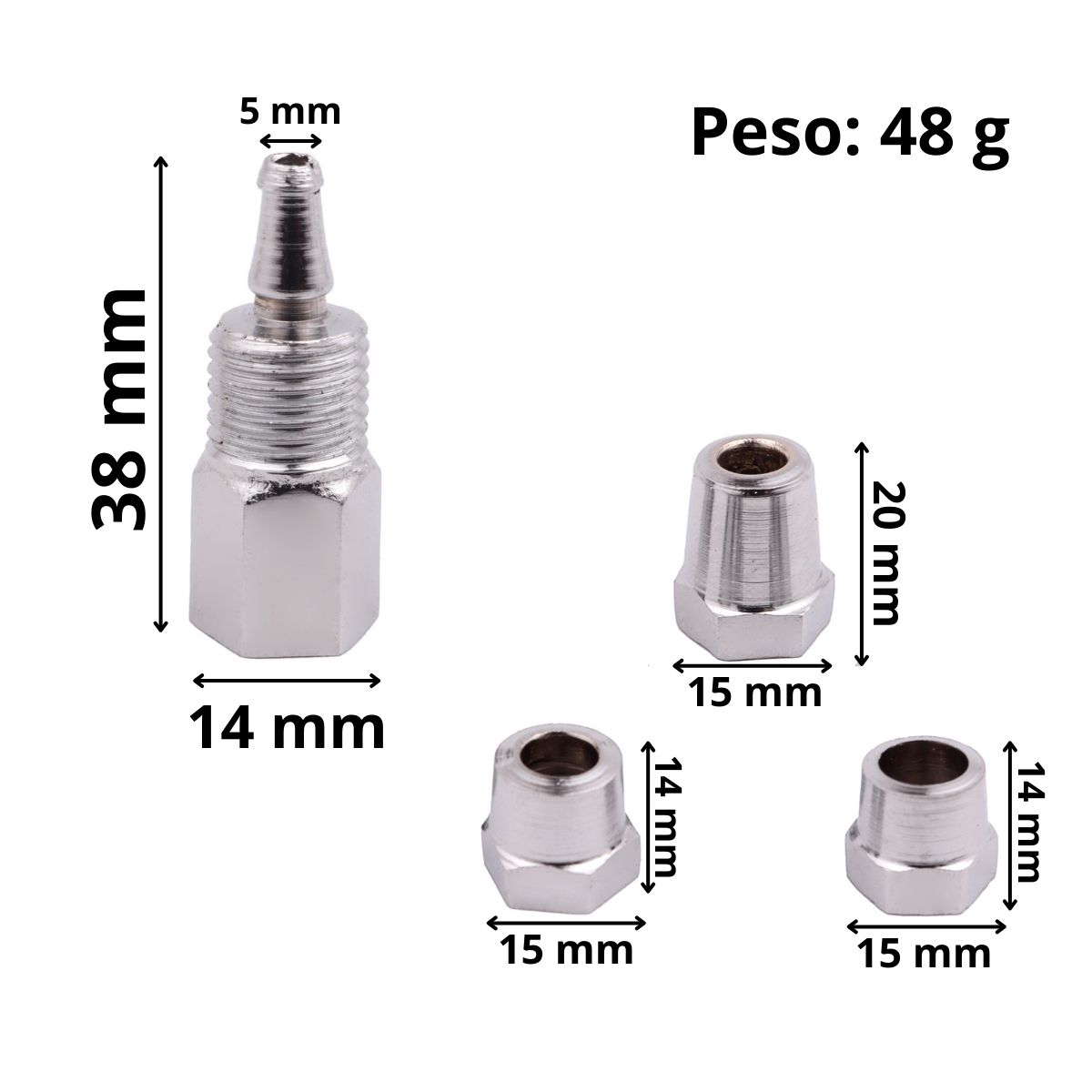 Dimensões: Altura 38mm x Diâmetro Rosca 14mm x Diâmetro Bico 5mm
