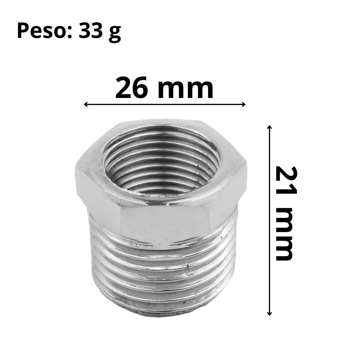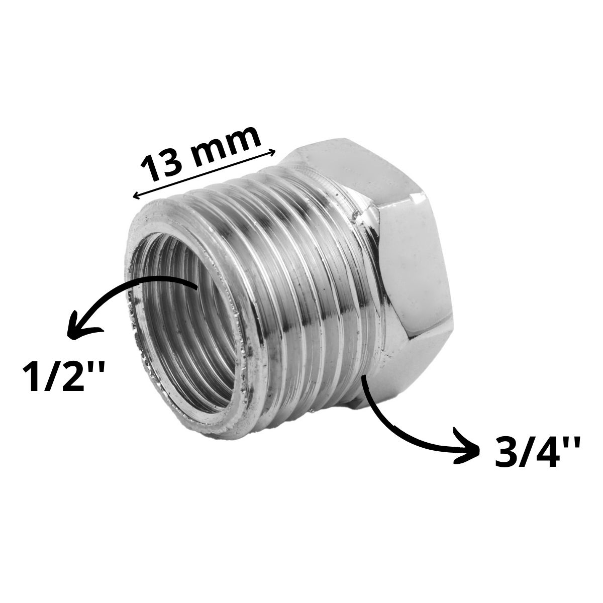 A bucha de redução de latão cromada rosca x rosca 3/4 x 1/2 é um acessório utilizado em sistemas hidráulicos e de encanamento para conectar tubos ou peças com tamanhos diferentes.