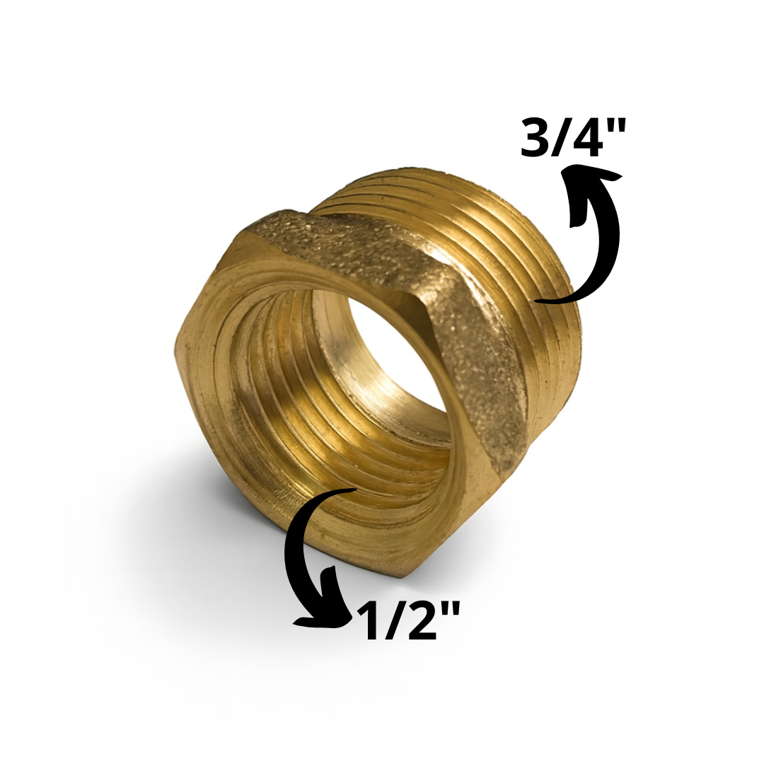 Conexão: A bucha possui uma conexão de rosca fêmea de 3/4 polegada em uma extremidade e uma conexão de rosca macho de 1/2 polegada na outra extremidade, permitindo a conexão com tubos ou peças com essas especificações.